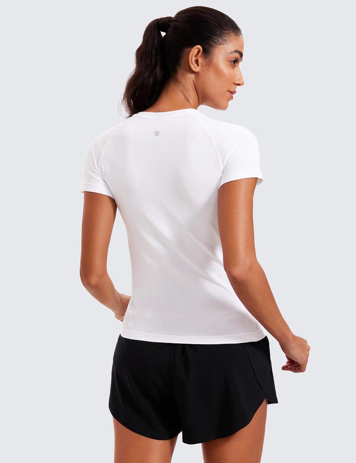 CRZ YOGA Seamless Workout Tops for Women Hip Length – Athletic Running Gym Yoga Short Sleeve Shirts Breathable Crewneck Tees(White)