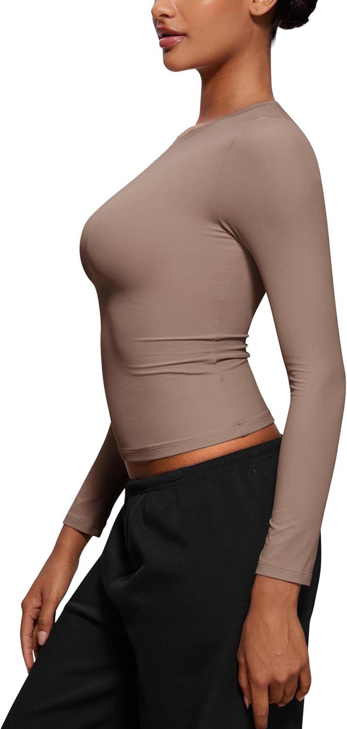 CRZ YOGA Softembrace Crewneck Long Sleeve Shirts for Women – Casual Going Out Tops Soft Basic Fitted Tight Fall T-Shirts(Mojave Tan)