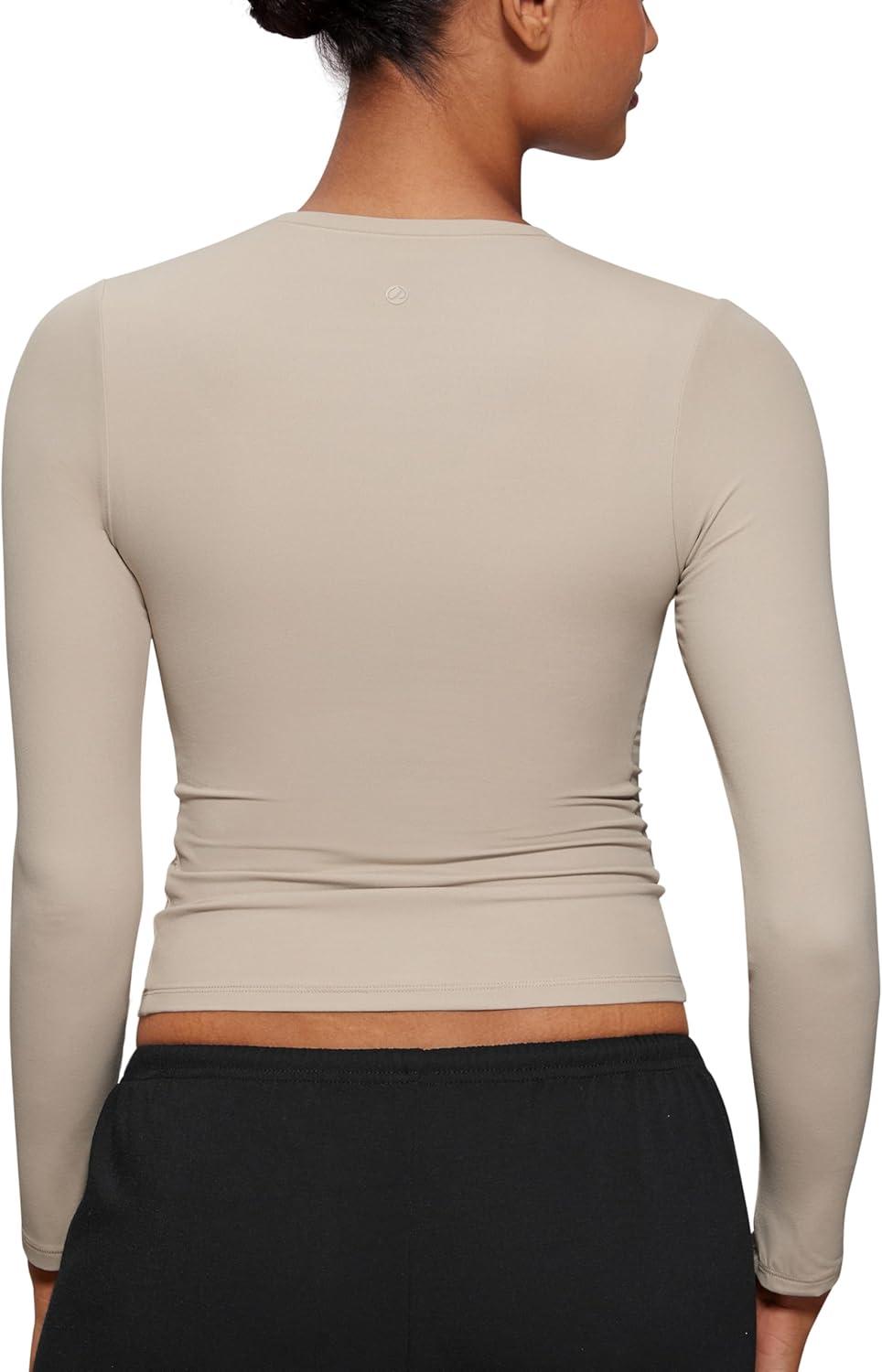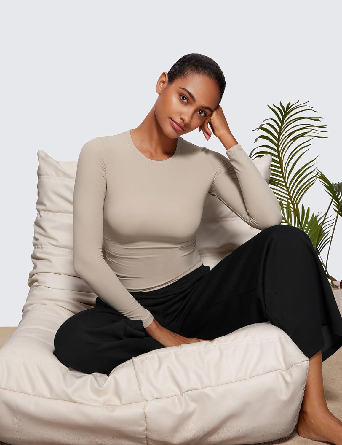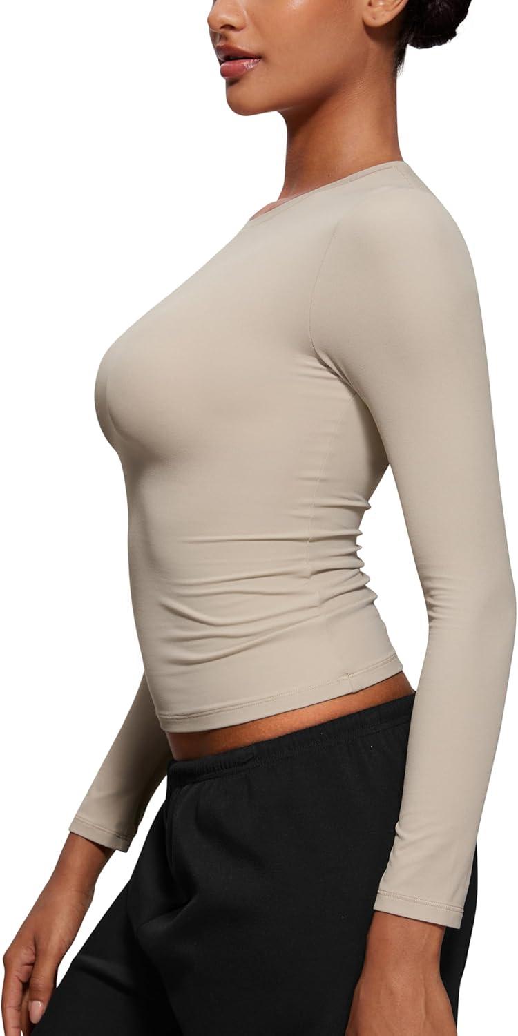 CRZ YOGA Softembrace Crewneck Long Sleeve Shirts for Women – Casual Going Out Tops Soft Basic Fitted Tight Fall T-Shirts(Mojave Tan)