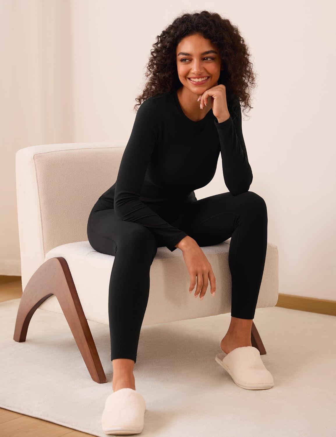 CRZ YOGA Softembrace Fleece Lined Thermal Underwear Set for Women - Soft Casual Base Layer Long Johns Warm Pajamas Top Bottom(Black)
