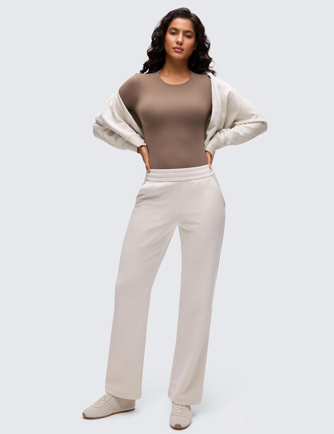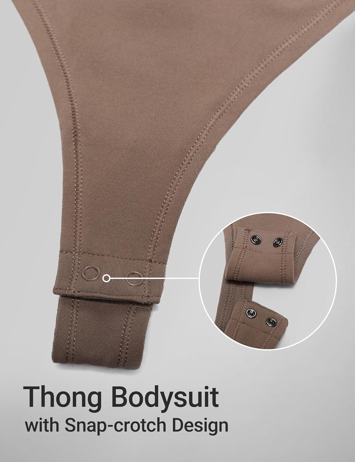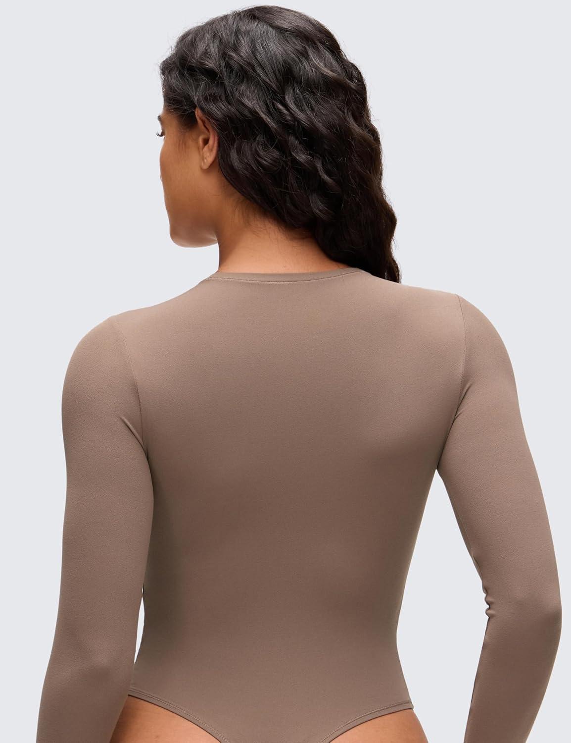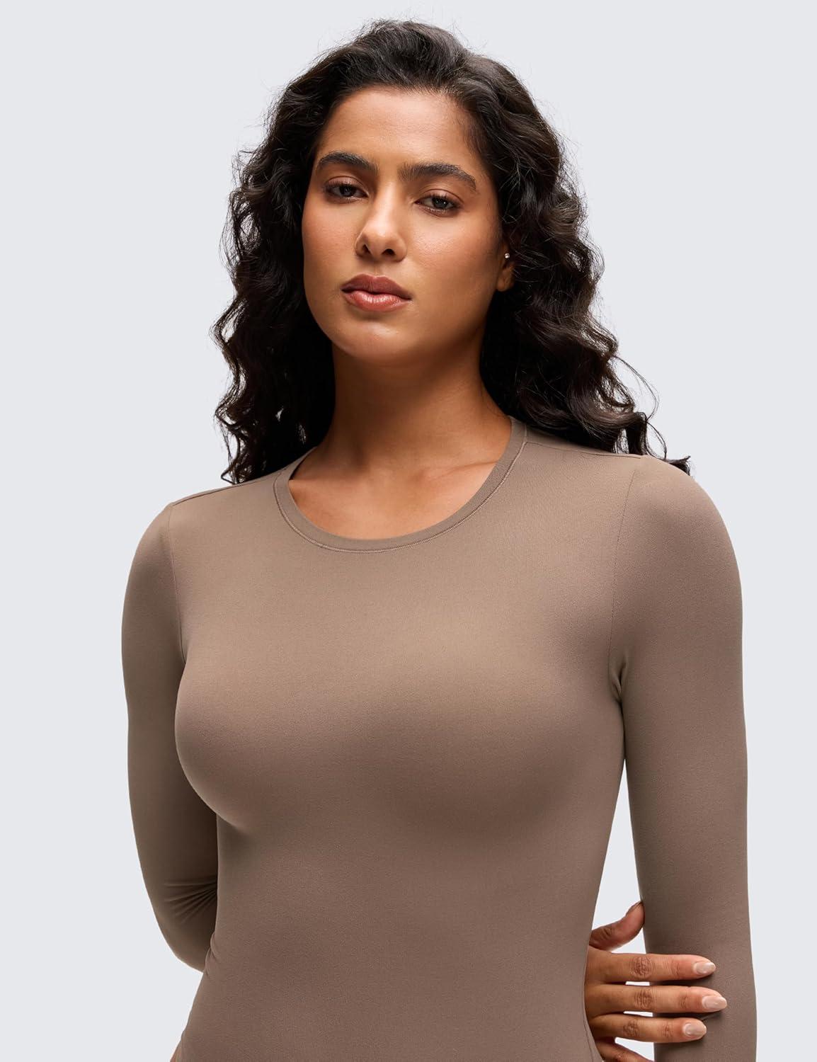 CRZ YOGA Softembrace Long Sleeve Bodysuits for Women – Crewneck Basic Casual Travel Thong Body Suits Fitted Tops(Mojave Tan)