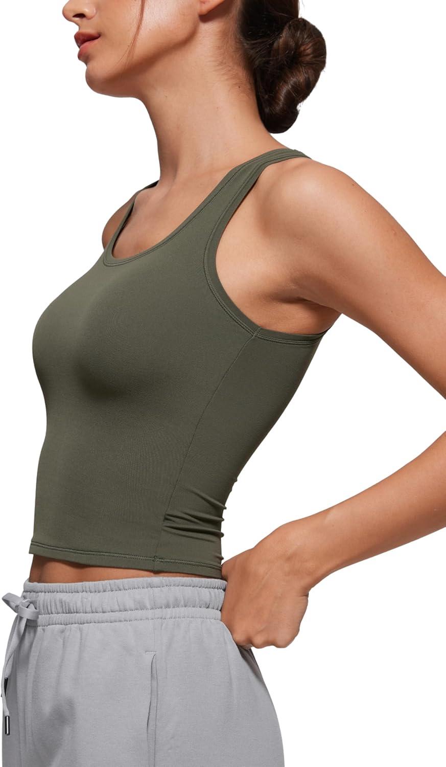 CRZ YOGA Softembrace Scoop Neck Tank Tops for Women – Casual Going Out Soft Double Lined Crop Basic Sleeveless Shirts(Light Army Green)