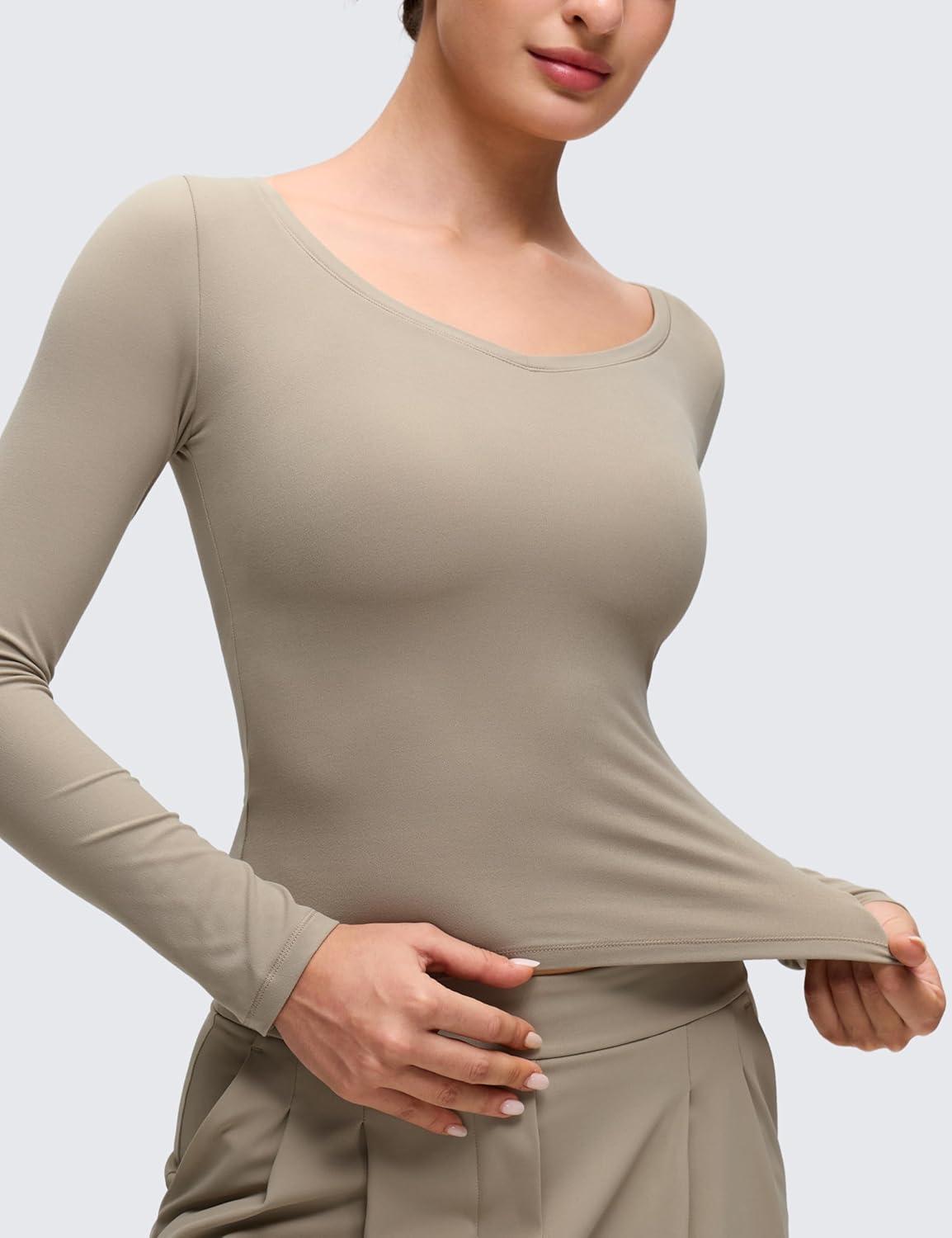 CRZ YOGA Softembrace V Neck Long Sleeve Shirts for Women – Casual Going Out Soft Comfort Tops Fitted Sexy Scoop Tees(Oak)
