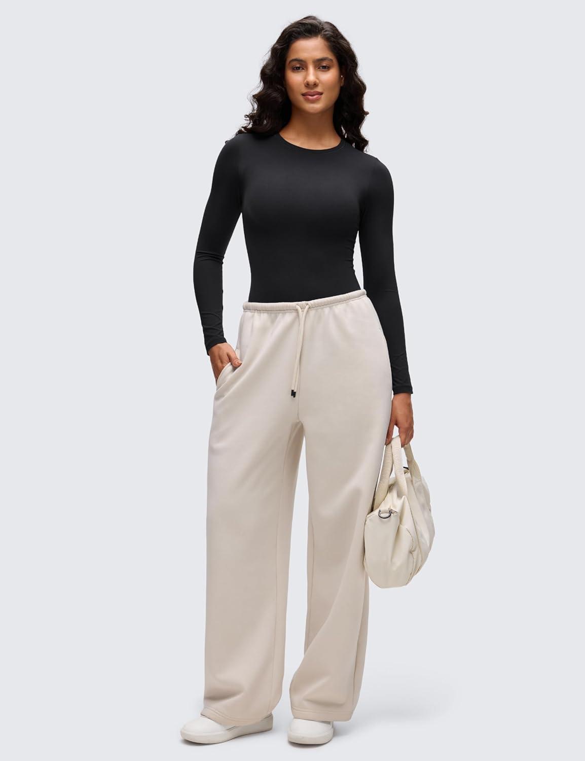 CRZ YOGA Softembrace Womens Basic Long Sleeve Crew Neck Bodysuits Casual Stretchy Fitted Thong Body Suits Tops(White)