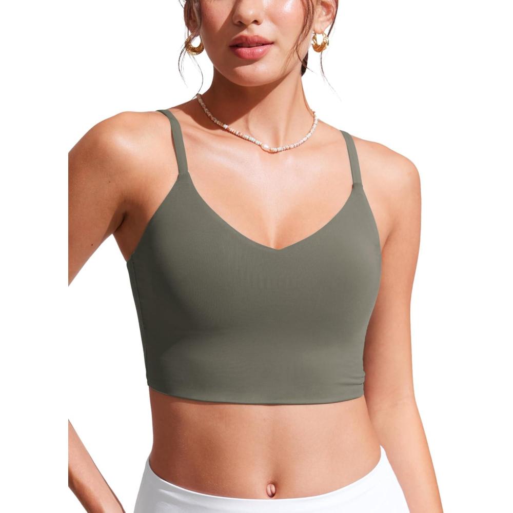 CRZ YOGA V Shaped Longline Bikini Tops for Women – Padded Cropped Adjustable Spaghetti Straps Swimsuit Athletic Bathing Suit(Light Army Green)