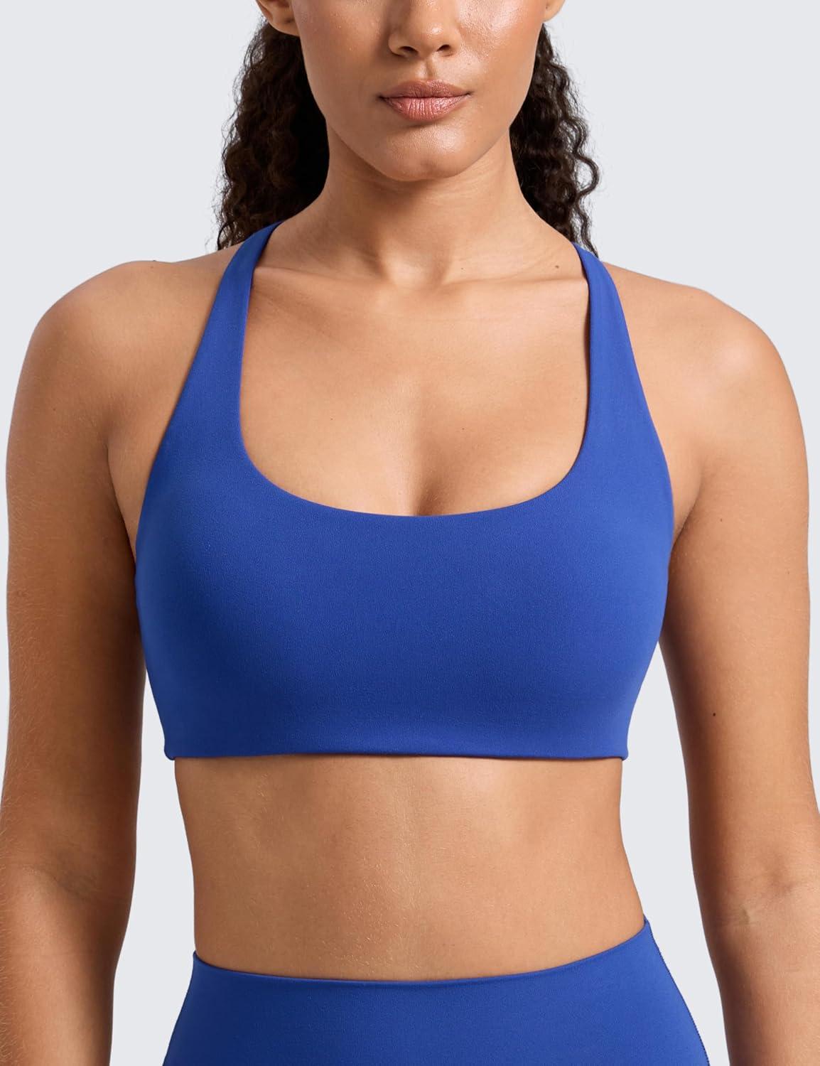 CRZ YOGA Womens Butterlift Cross Back Sports Bra – Scoop Neck Adjustable Straps Wireless Padded Pilates Workout Top(Twilight Blue)